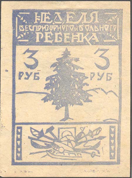 1925(?) г. Листок разм. 70 х 104 мм. Одноцветная печать на белой бумаге. В центре в прямоугольной рамке разм. 63 х 90 мм елка, горки и играющие дети. Сверху текст в три строки: «Неделя беспризорного и больного ребенка». Внизу разнообразный спортивный инвентарь. Под рамкой внизу номинал: «Цена 1 р…