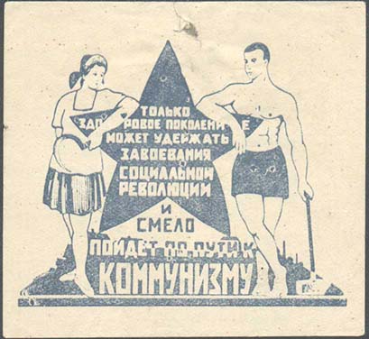 1925(?) г. Разм. 68 х 63 мм. Одноцветная печать на белой бумаге. В центре пятиконечная звезда, по краям юноша и девушка. На звезде текст в шесть строк: «Только здоровое поколение может удержать завоевания социальной революции». Внизу продолжение текста в четыре строки: «И смело пойдет по пути к к…