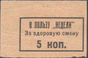 1925(?) г. Разм. 51 х 26 мм. Одноцветная печать на желто-ватой бумаге. В центре в прямоугольной рамке разм. 38 х 20 мм. Текст в две строки: «В пользу «Недели» За здоровую смену».