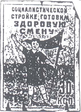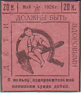 1926 г. Май. Разм. 44 х 55 мм. Одноцветная печать на серо-карминовой бумаге. В центре в двойной прямоугольной рамке серп и молот, на рукоятке которого сидит ребенок. По периметру между рамками текст: «Дети должны быть здоровыми. В пользу оздоровительной компании среди детей». Сверху пятиконечная з…