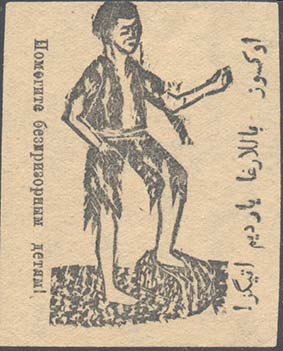 1926(?) г. Разм. 34 х 70 мм. Одноцветная печать на белой бумаге. В центре беспризорник. Слева вертикально сверху вниз текст: «Помогите беспризорным детям!». Справа вертикально текст на местном языке арабским шрифтом.