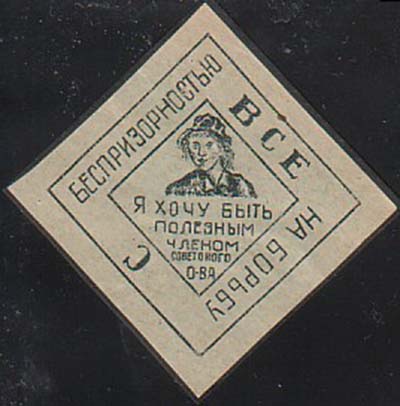 1926(?) г. Разм. 67 х 67 мм. Одноцветная печать на серо-зеленой бумаге. В центре в двойной рамке в форме ромба разм. 52 х 52 мм погрудное изображение беспризорного ребенка. Ниже текст в пять строк: «Я хочу быть полезным членом советского о-ва». Текст по периметру между рамками: «Все на борьбу с б…