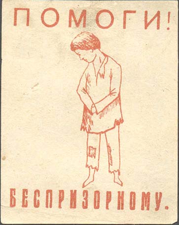1926(?) г. Разм. 61 х 77 мм. Одноцветная печать на плотной белой бумаге. В центре беспризорник. Сверху текст: «Помоги!». Внизу продолжение текста: «Беспризорному».