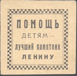 1926(?) г. Разм. 46 х 45 мм. Одноцветная печать на бумаге различных цветов. В центре в прямоугольной рамке разм. 36 х 36 мм с шахматным узором текст в четыре строки: «Помощь детям – лучший памятник Ленину».