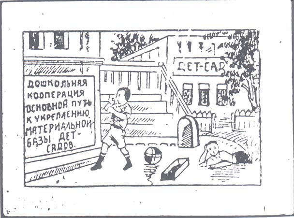 1926(?) г. Листок разм. 104 х 77 мм. Одноцветная печать на розово-серой плотной бумаге. В центре в прямоугольной рамке разм. 85 х 56 мм двое детей на фоне детского сада. На стене текст в семь строк: «Дошкольная кооперация основной путь к укреплению материальной базы детсадов».