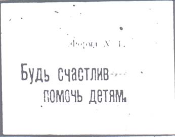 1926(?) г. Разм. 60 х 45 мм. Одноцветная печать на тонкой желтоватой бумаге. В центре текст: «Форма №1». Ниже текст в две строки: «Будь счастлив помочь детям».