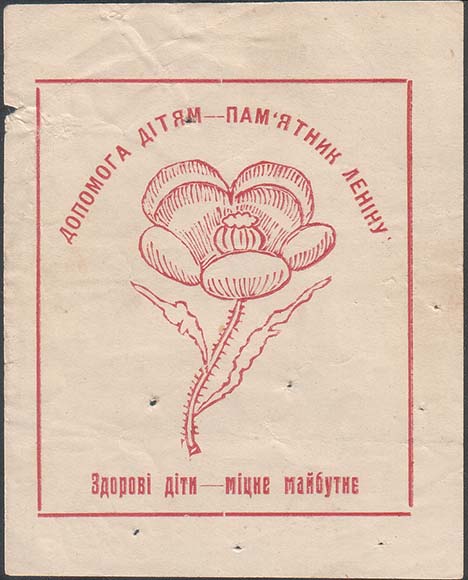 1928 г. 03.-04.06.1928 Разм. 78 х 96 мм. Одноцветная печать на белой бумаге. В прямоугольной рамке разм. 64 х 73 мм цветок мака. Сверху полукругом текст на украинском языке: «Помощь детям – памятник Ленину». Внизу текст на украинском языке: «Здоровые дети – прочное будущее».