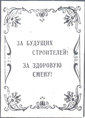 1930(?) г. Разм. 59 х 81 мм. Одноцветная печать на серо-голубой бумаге. В центре в декоративной рамке 53 х 72 мм текст в четыре строки: «За будущих строителей! За здоровую смену!».