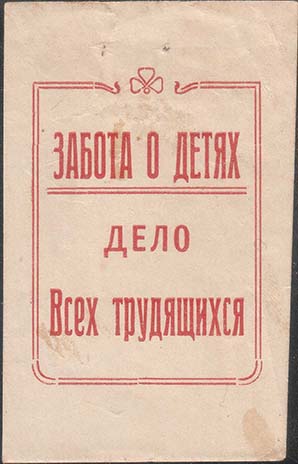 1930(?) г. Разм. 49 х 77 мм. Одноцветная печать на белой бумаге. В центре в двойной декоративной рамке 39 х 51 мм закругленной внизу текст в три строки: «Забота о детях дело всех трудящихся».