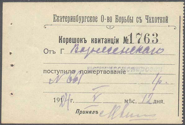 1924 г. Корешок квитанции разм. 98 х 65 мм. Одно-цветная печать на белой бумаге. Правосторонняя зубц. 11 1/2. Сверху текст: «Екатеринбургское О-во Борьбы с Чахоткой». Ниже текст в пять строк: «Корешок квитанции №... От Г... поступило пожертвование... 191 г. ...мес ... дня. Принял...