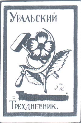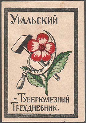 1925 г. Разм. рамки 55 х 55 мм. Трехцветная печать на белой бумаге. Сверху в двойной овальной рамке цветок мака в обрамлении снопа серпа и молота и оливковой ветви. Внизу текст в три строки: «Уральский туберкулезный трехдневник». Справа внизу под рамкой выходные данные мелким шрифтом: «Лит. Акц. …