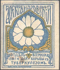 1916(?) г. Разм. рамки 35 х 43 мм. Двухцветная печать на белой бумаге. В двойной прямоугольной рамке в центре в декоративной рамке цветок ромашки. Сверху текст: «Александровский». Внизу продолжение текста в три строки: «Отдел Всеросс[ийс]к[ой]. Лиги для борьбы с туберкулезом». Внизу под рамкой ме…