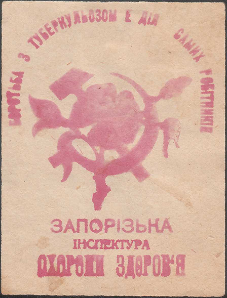 1925(?) г. Разм. 57 х 73 мм. Одноцветная печать на белой бумаге. Оттиск штемпеля, в центре которого цветок мака на фоне серпа и молота. Сверху полукругом текст на украинском языке: «Борьба с туберкулезом есть дело самих трудящихся». Внизу текст в три строки на украинском языке: «Запорожская инспе…