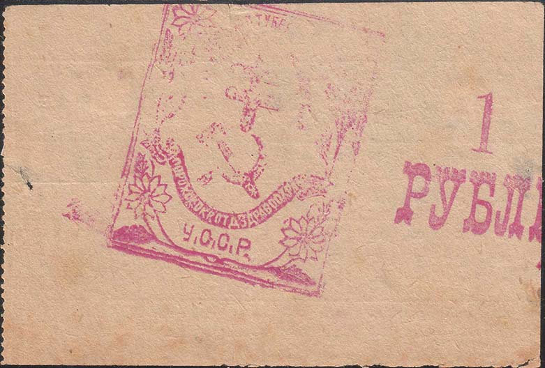 1925 г. Листок из квитанционной книжки разм. 98 х 65 мм. Одноцветная печать на желтоватой бумаге. Левосторонняя зубц. 11 1/4. Слева оттиск штемпеля, в центре которого шестиконечный крест и серп и молот. Сверху полукругом текст в две строки на украинском языке: «Борьба с туберкулезом есть дело сам…