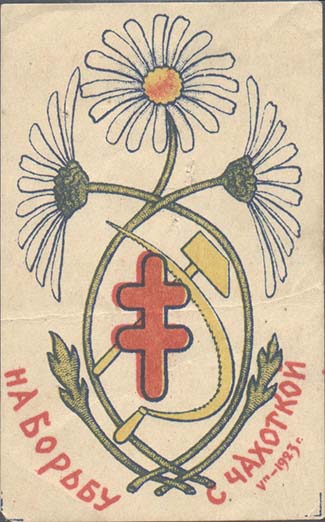 1923 г. 07.1923 г. Разм. 54 х 88 мм. Многоцветная печать на белой бумаге. В центре Лотарингский крест и серп и молот в обрамлении венка из трех ромашек. Внизу полукругом текст: «На борьбу с чахоткой». Справа в углу дата: «VII-1923 г.». По углам разграничительные линии.