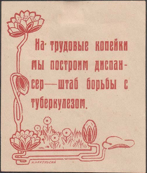 1923(?) г. Разм. 63 х 74 мм. Одноцветная печать на белой бумаге. Слева и внизу растительный орнамент из цветов. В центре текст в четыре строки: «На трудовые копейки построим диспансер – штаб борьбы с туберкулезом». Внизу мелким шрифтом выходные данные: «Н. Никольский».