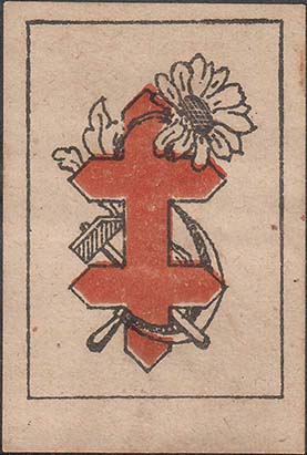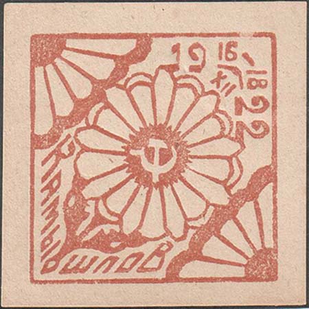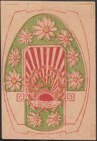 1922(?) г. Разм. 35 х 51 мм. Двухцветная печать на сероватой бумаге. В прямоугольной рамке разм. 29,5 х 43 мм шестиконечный крест на фоне серпа и молота и цветка ромашки.