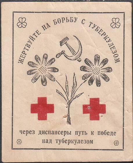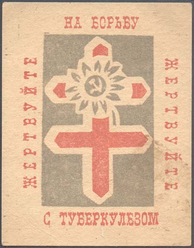 1925(?) г. Разм. 66 х 84 мм. Двухцветная печать на толстой желтоватой бумаге. В центре на сплошном фоне шестиконечный крест и цветок с серпом и молотом в центре. По периметру текст: «Жертвуйте на борьбу с туберкулезом».