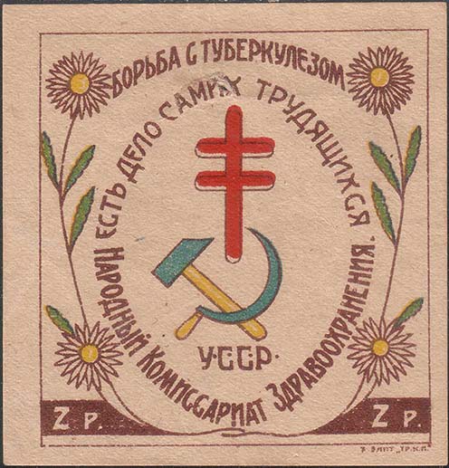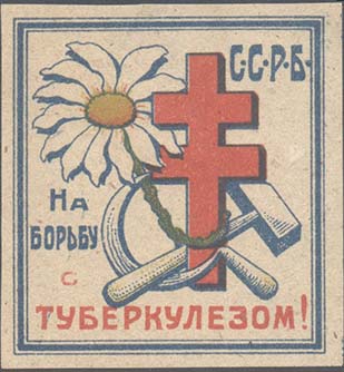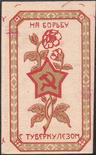 1923 г. Разм. 62 х 64 мм. Многоцветная печать на желтоватой бумаге. В центре серп и молот, шестиконечный крест и аббревиатура «У.С.С.Р.» на фоне лучей восходящего солнца в обрамлении венка из цветов ромашки. Сверху полукругом текст: «Борьба с туберкулезом». В центре по овалу продолжение текста: «…