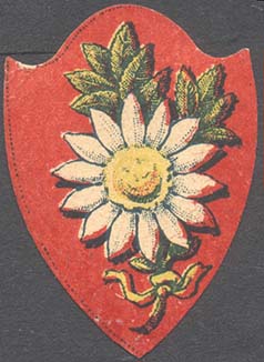 1915 г. Виньетка в виде щитка сложной формы разм. 38 х 54 мм. Многоцветная печать на белой бумаге. В центре на сплошном фоне цветок ромашки с двумя листьями и стеблем, перевитым внизу лентой.