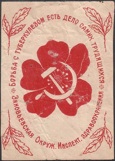 1930(?) г. Разм. 53 х 70 мм. Одноцветная печать на белой бумаге. В центре цветок мака и серп и молот. По окружности текст: «Борьба с туберкулезом есть дело самих трудящихся. Зиновьевская Окруж[ная]. Инспект[ура]. здравоохранения». По углам растительный орнамент.