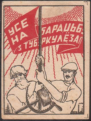 1925(?) г. Разм. 52 х 69 мм. Двухцветная печать на белой бумаге. В прямоугольной рамке разм. 37,5 х 67 мм в центре рабочий и крестьянин держат флаг на фоне лучей восходящего солнца. На полотнище флага текст в три строки на белорусском языке: «Все на борьбу с туберкулезом!». Внизу скрещенные серп …