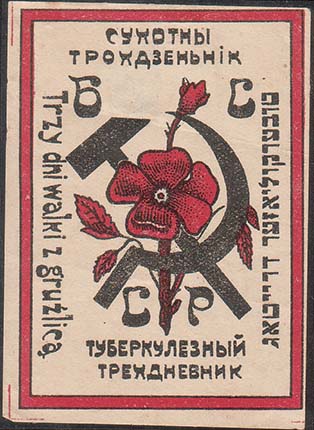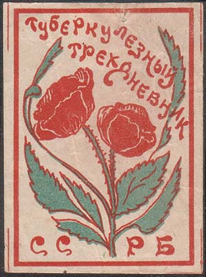 1925(?) г. Разм. 51 х 70 мм. Двухцветная печать на плотной белой бумаге. В толстой прямоугольной рамке разм. 57,5 х 65,5 мм в центре цветок мака на фоне скрещенного серпа и молота и буквы аббревиатуры «Б.С.С.Р.». По периметру текст на четырех языках: «Туберкулезный трехдневник».