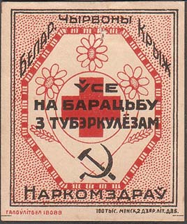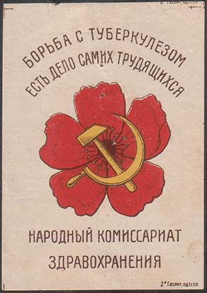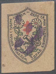 1923(?) г. Разм. 49 х 68 мм. Трехцветная печать на белой бумаге. В центре цветок мака и серп и молот. Сверху полукругом текст в две строки: «Борьба с туберкулезом есть дело самих трудящихся». Внизу текст в две строки: «Народный Комиссариат Здравоохранения». Справа внизу мелким шрифтом выходные да…