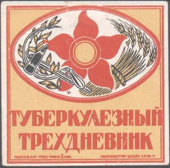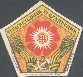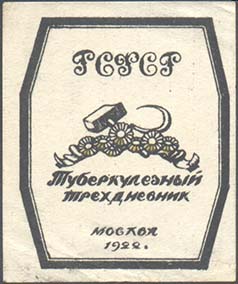1922 г. Одноцветная и двухцветная печать на бумаге различных цветов. В центре в двойной восьмиугольной рамке разм. 35 х 42 мм. серп и молот, лента и цветы ромашки. Сверху аббревиатура «РСФСР». Внизу текст в четыре строки: «Туберкулезный трехдневник. Москва 1922 г.»