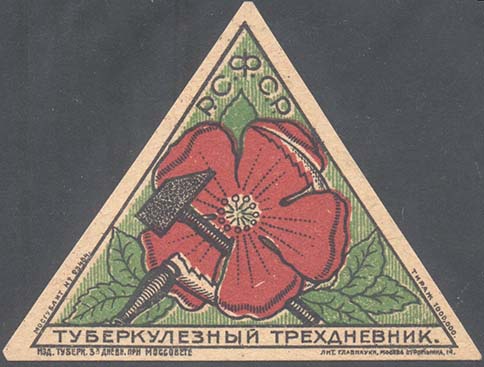 1926 г. 28-30.05.1926 г. Треугольник разм. рамки 71 х 55 мм. Трехцветная печать на сероватой бумаге. В центре в треугольной рамке на фоне из вертикальных штрихов цветок мака, серп и молот. Сверху по внутреннему контуру рамки аббревиатура «Р.С.Ф.С.Р.». Внизу текст: «Туберкулезный трехдневник». Сле…