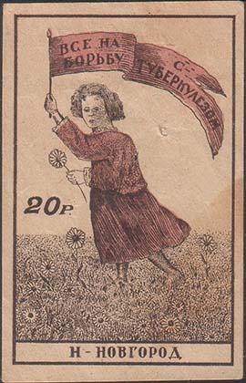 1922 г. Разм. 45 х 70 мм. Двухцветная печать на кремо-вой бумаге. В центре в прямоугольной рамке разм. 41 х 64 мм девочка, идущая по полю с ромашками. В правой руке девочка держит ромашку, в левой руке флаг с текстом в две строки: «Все на борьбу с туберкулезом». Внизу тест: «Н[ижний]-Новгород». В…