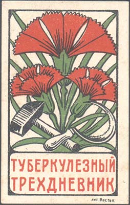 1924(?) г. Разм. 42 х 67 мм. Трехцветная печать на белой бумаге. В центре в прямоугольной рамке разм. 36 х 61 мм три гвоздики и серп и молот. Внизу текст в три строки: «Туберкулезный трехдневник». Внизу под рамкой справа выходные данные мелким шрифтом: «Лит. Восток».