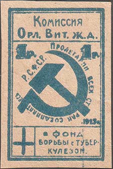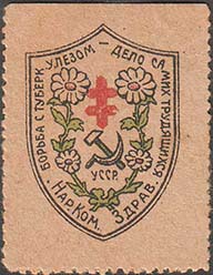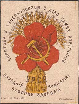 1925 г. Разм. 43 х 56 мм. Трехцветная печать на кремовой бумаге. В центре серп и молот на фоне цветка мака и снопа пшеницы. Сверху полукругом текст на украинском языке: «Борьба с туберкулезом есть дело самих трудящихся». Внизу полукругом текст в три строки на украинском языке: «У.С.С.Р. Народный …