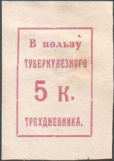 1924 г. Разм. 32 х 44 мм. Одноцветная печать тонкой белой бумаге. В прямоугольной рамке разм. 20 х 28 мм в центре номинал. Текст в три строки: «В пользу туберкулезного трехдневника».