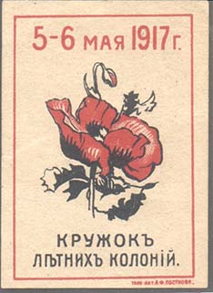 1917 г. 05.-06.05.1917 г. Разм. 39 х 54 мм. Двухцветная печать на желтоватой бумаге. В центре в прямоугольной рамке разм. 33,5 х 48,5 мм цветок мака с бутоном. Сверху дата: «5-6 мая 1917 г.». Внизу текст в две строки: «Кружок летних колоний». Внизу справа под рамкой мелким шрифтом выходные данные:…