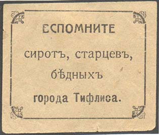 1912(?) г. Разм. рамки 45 х 36,5 мм. Одноцветная печать на белой бумаге. В рамке текст в четыре строки: «Вспомните сирот, старцев, бедных города Тифлиса».
