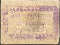 1916(?) г. Разм. 36 х 26 мм. Одноцветная печать на серо-желтой бумаге низкого качества. В центре в рамке из орнамента текст в три строки: «Благодарность от бедных учеников».