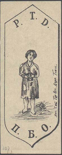 1917 г. 10.10.1917 г. Разм. 37 х 91 мм. Одноцветная печать на тонкой белой бумаге. В центре в фигурной рамке сложной формы разм. 33 х 85 мм подросток в изношенной одежде. Внизу аббревиатура П.Б.О. на русском языке, сверху та же аббревиатура на польском языке. Справа вертикально снизу вверх выходны…