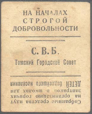 1930 г. 1930 г. Разм. 51 х 63 мм. Одноцветная двухсторонняя печать на бумаге различных цветов. На лицевой стороне в центре текст в две строки: «С.В.Б. Томский Городской Совет». Сверху текст в три строки: «На началах строгой добровольности». Внизу перевернутый текст в четыре строки: «Собранные сре…