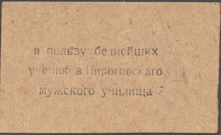 1916(?) г. Разм. 74 х 44 мм. Одноцветная печать на серо-желтой бумаге низкого качества. В центре текст в три строки: «В пользу беднейших учеников Пироговского мужского училища».