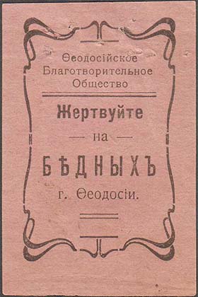1916 г. Разм. 46 х 69 мм. Одноцветная печать на темно-серой бумаге. В фигурной декоративной рамке разм. 38 х 57 мм в центре текст в четыре строки: «Жертвуйте на бедных г. Феодосии». Сверху и снизу декоративные элементы в виде горизонтальных штрихов. Сверху текст в три строки: «Феодосийское Благот…