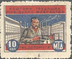 1932(?) г. Многоцветная печать на белой рыхлой бумаге. Текст на украинском языке: «Средствами трудящихся ликвидируем нищенство. Отделение общества Г[ородских] О[бществ] П[помощи]».