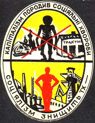 1931 г. 15.08.1931 г. Виньетка в форме овала разм. 55 х 71 мм. Трехцветная печать на белой бумаге. В двойной овальной рамке аллегорический рисунок: сверху силуэт больного человека на фоне трактира и церкви, внизу силуэт здорового человека на фоне заводов. По периметру между рамками текст на украин…