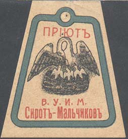 1913 г. Виньетка в форме трапеции разм. 46 х 42 мм. Трехцветная печать на кремовой бумаге. В центре эмблема В.У.И.М. Текст: «Приют В.У.И.М. Сирот-Мальчиков».