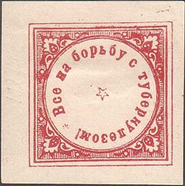 1929 г. Разм. 28 х 45 мм. Одноцветная печать на бумаге различных цветов. Зубц. 14 1/2. В двойной прямоугольной декоративной рамке в центре номинал. Сверху текст в две строки: «Все на борьбу». Внизу продолжение текста: «С туберкулезом».