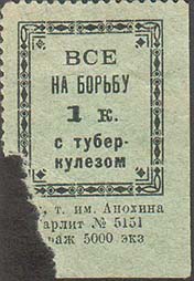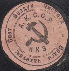 1924 г. Круг диаметром 35 мм. Одноцветная печать на розовой бумаге. На лицевой стороне в тройной круглой рамке диаметром 35 мм серп и молот. Сверху аббревиатура «А,К.С.С.Р.». Внизу аббревиатура «НКЗ». По периметру между рамками текст: «Враги чахотки: Свет, Воздух, чистота».