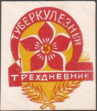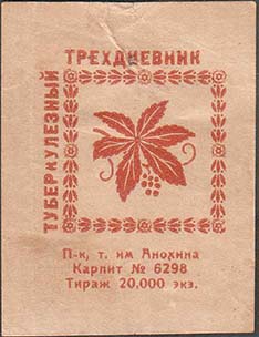 1930(?) г. Разм. рамки 24 х 24 мм. Одноцветная печать на светло-желтой бумаге. В центре ветка бузины(?). По периметру рамки текст: «Туберкулезный трехдневник». Внизу под рамкой мелким шрифтом выходные данные: «П-к, т. им. Анохина Карлит №6298 Тираж 20.000 экз.».