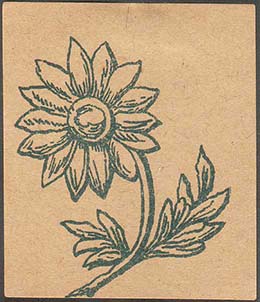 0 г. Разм. 41 х 51 мм. Одноцветная печать на бумаге различных цветов. В центре цветок ромашки с толстым стеблем, загнутым влево вниз и двумя листьями.