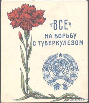 1924 г. 23.-24.04.1924 г. Разм. 46 х 57 мм. Трехцветная печать на белой бумаге. Слева цветок гвоздики с загнутым горизонтально стеблем. Справа в верхнем углу текст в три строки: «Все на борьбу с туберкулезом». Справа внизу герб СССР с шестью лентами. В правом нижнем углу мелким шрифтом выходные да…