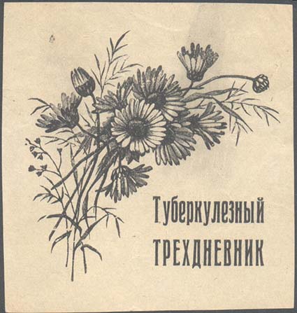 1925(?) г. Разм. 75 х 80 мм. Одноцветная печать на кремовой бумаге. Слева букет из цветов ромашки. Справа внизу текст: «Туберкулезный трехдневник».
